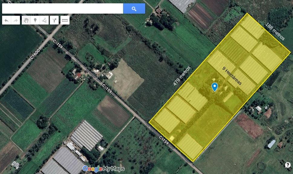 Dimensiones: 188 metros x 478, 35 metros. 9 hectáreas, 5 Centiáreas; 38 Decímetros Cuadrados. (más linderos x calles no abiertas)