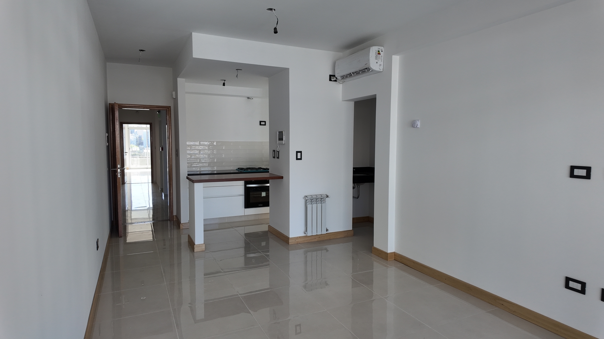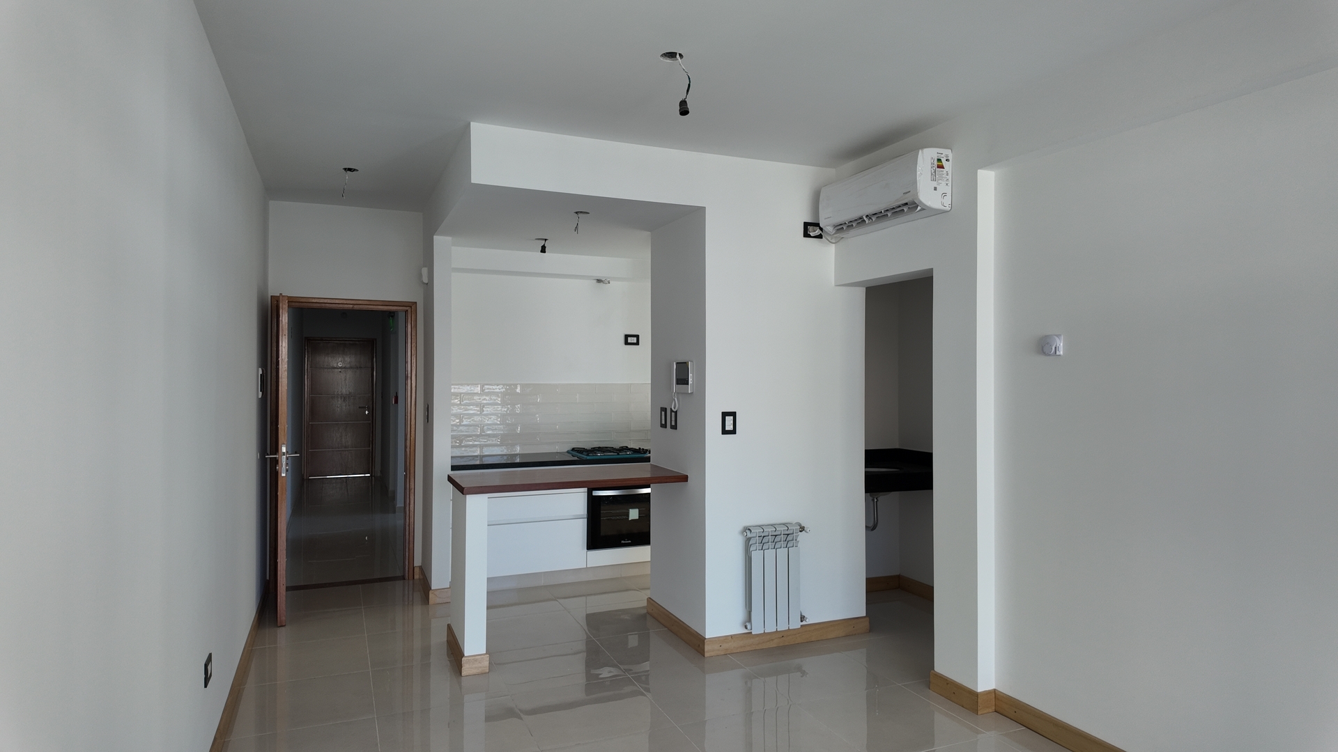 Acceso a un amplio living comedor con aire acondicionado instalado, pisos de porcelanato simil madera, portero visor con camara y Puerta ventana de salida al balcon semicubierto con vistas al frente