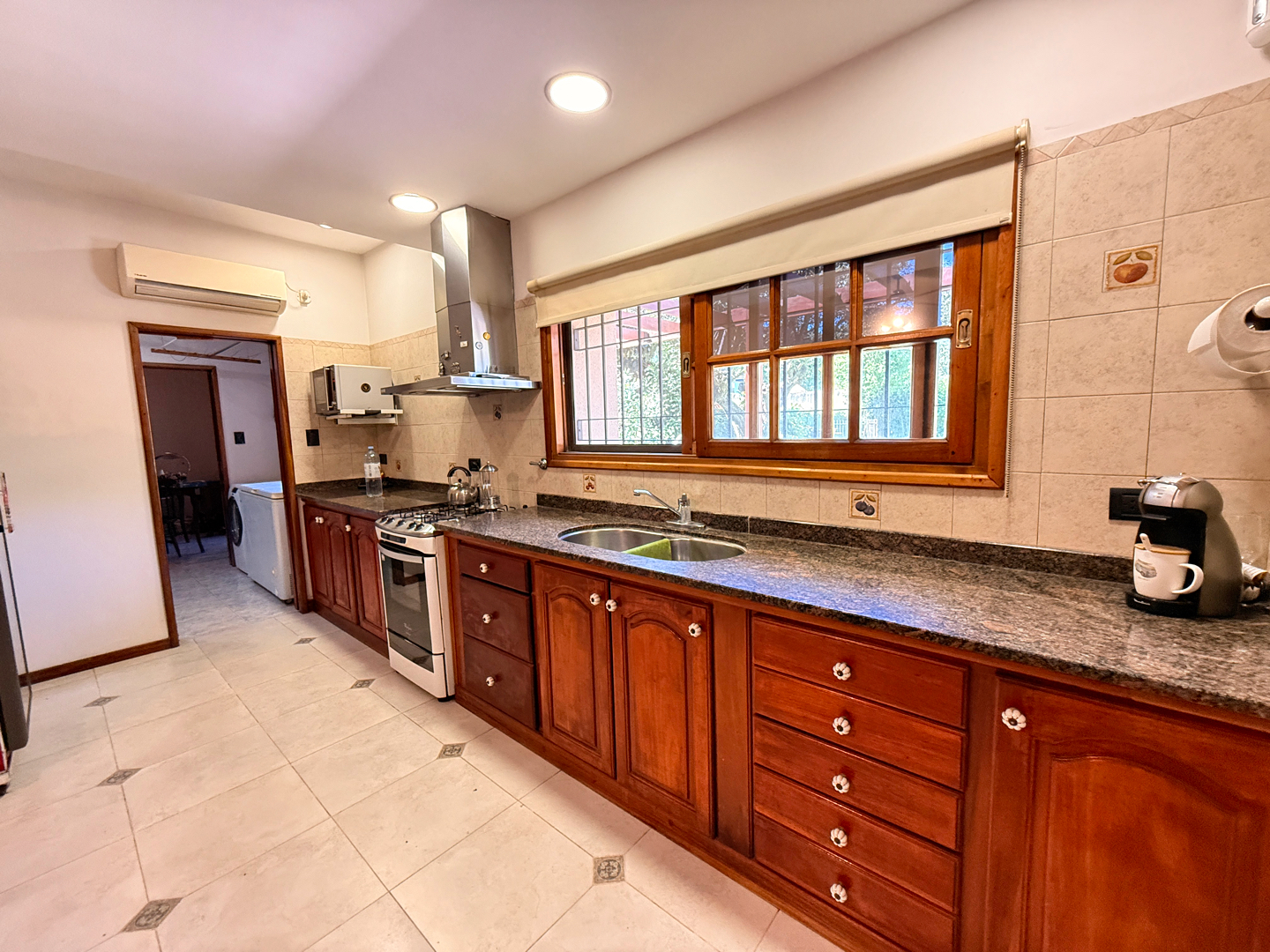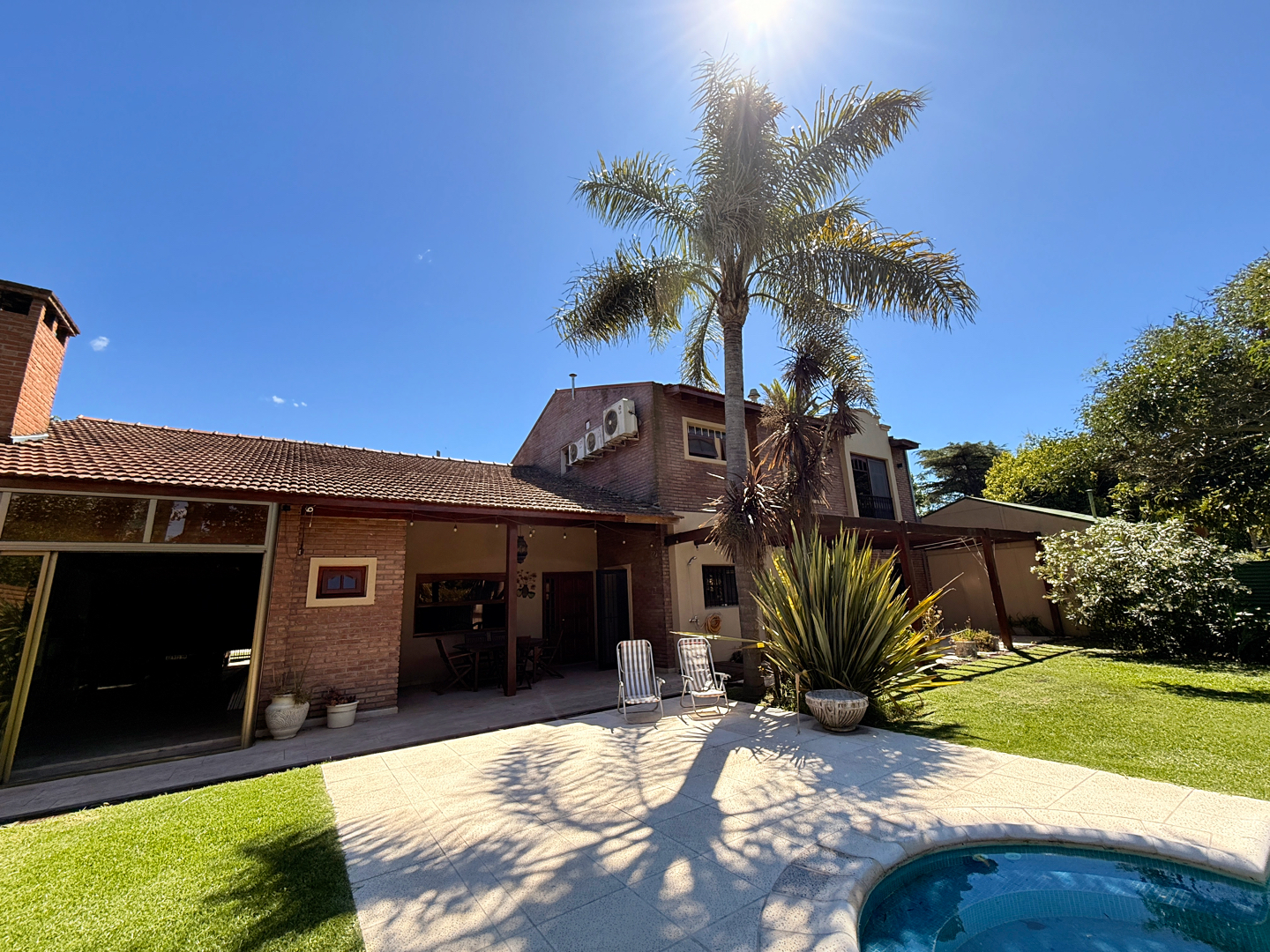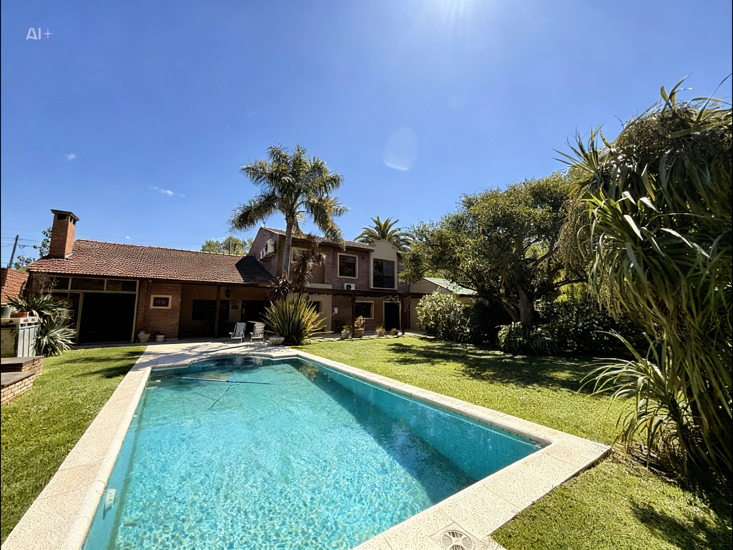 Gran parque con pileta, cochera cubierta para dos autos, semicubiertas para 4 y pasante al parque.