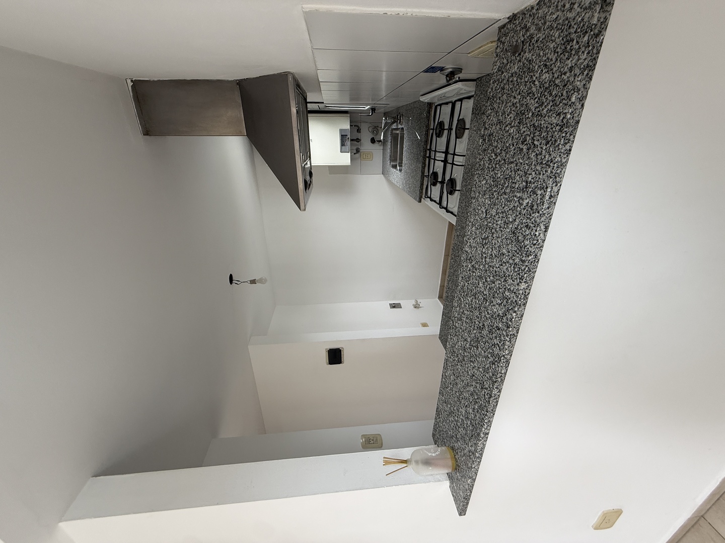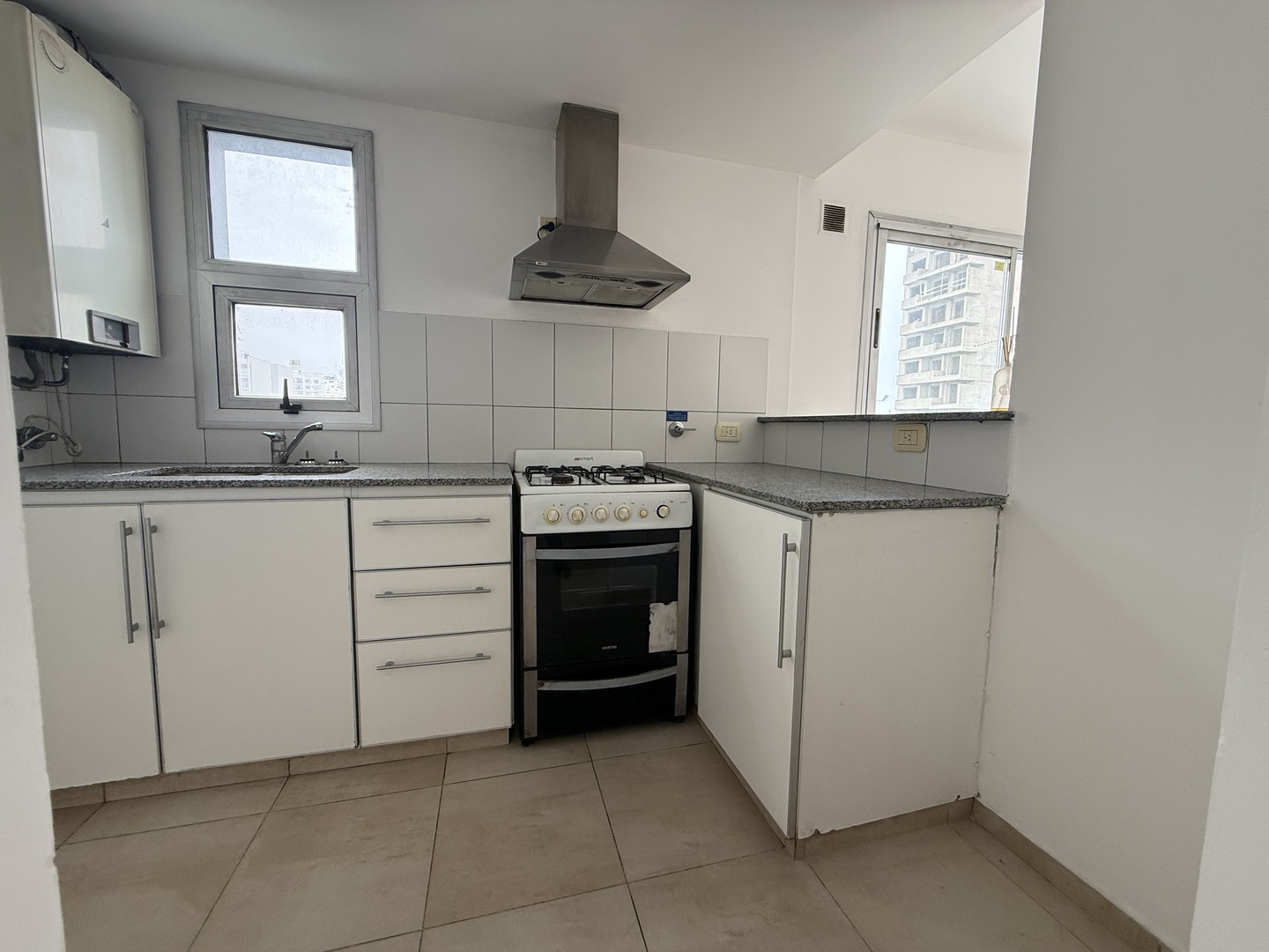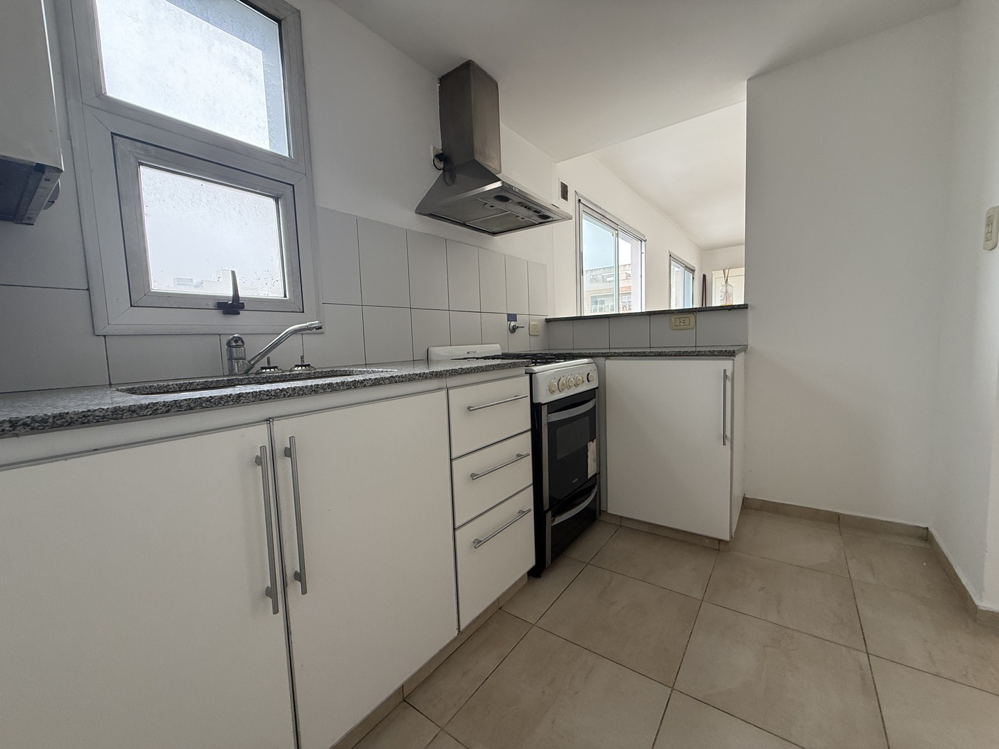 Cocina semi-integrada con barra desayunadora, doble mesada de granito, artefacto cocina, doble bacha con griferia FV monocomando, ventilacion natural.