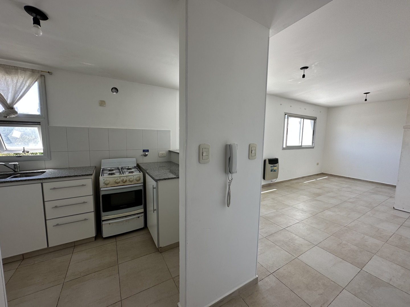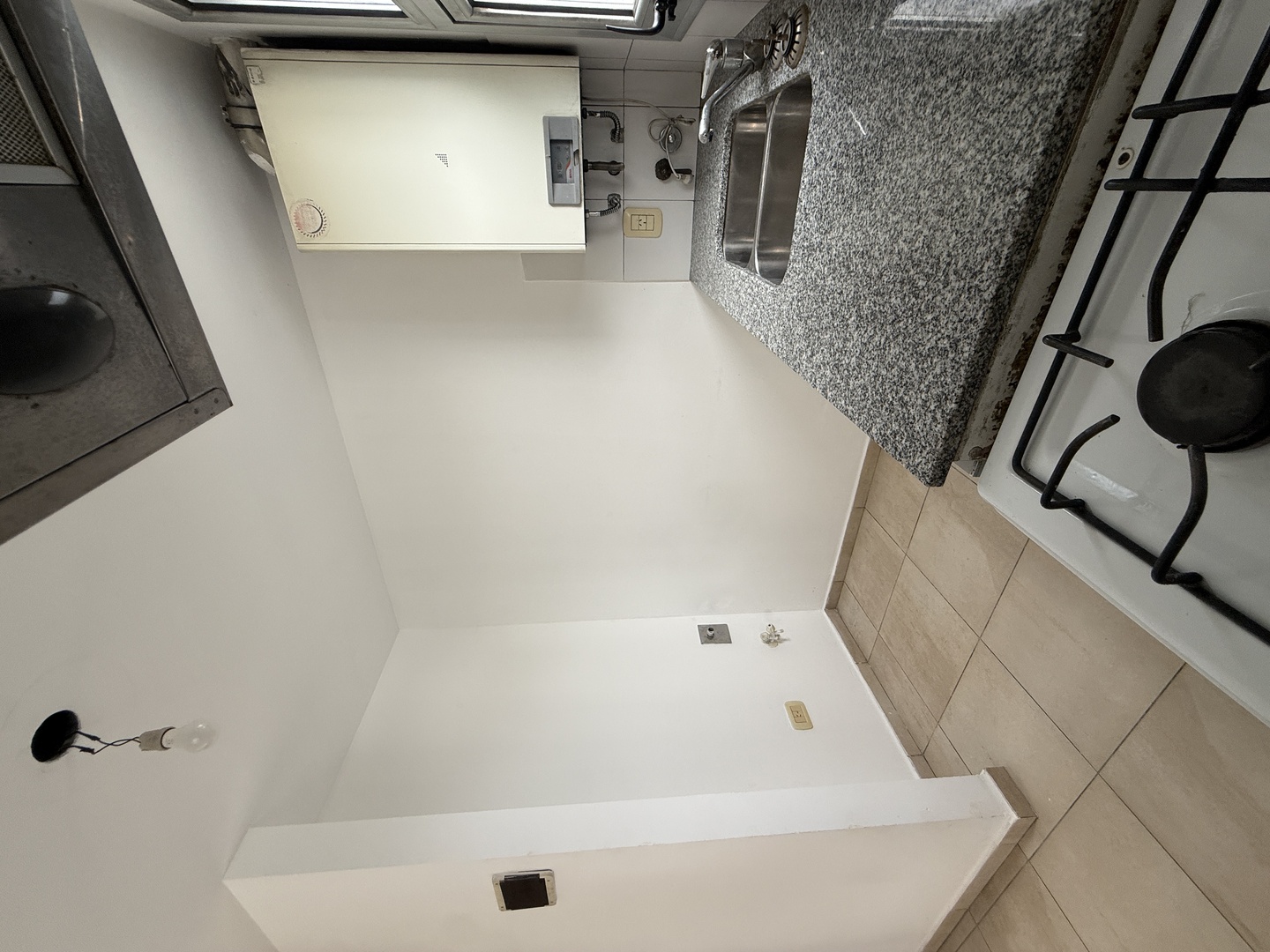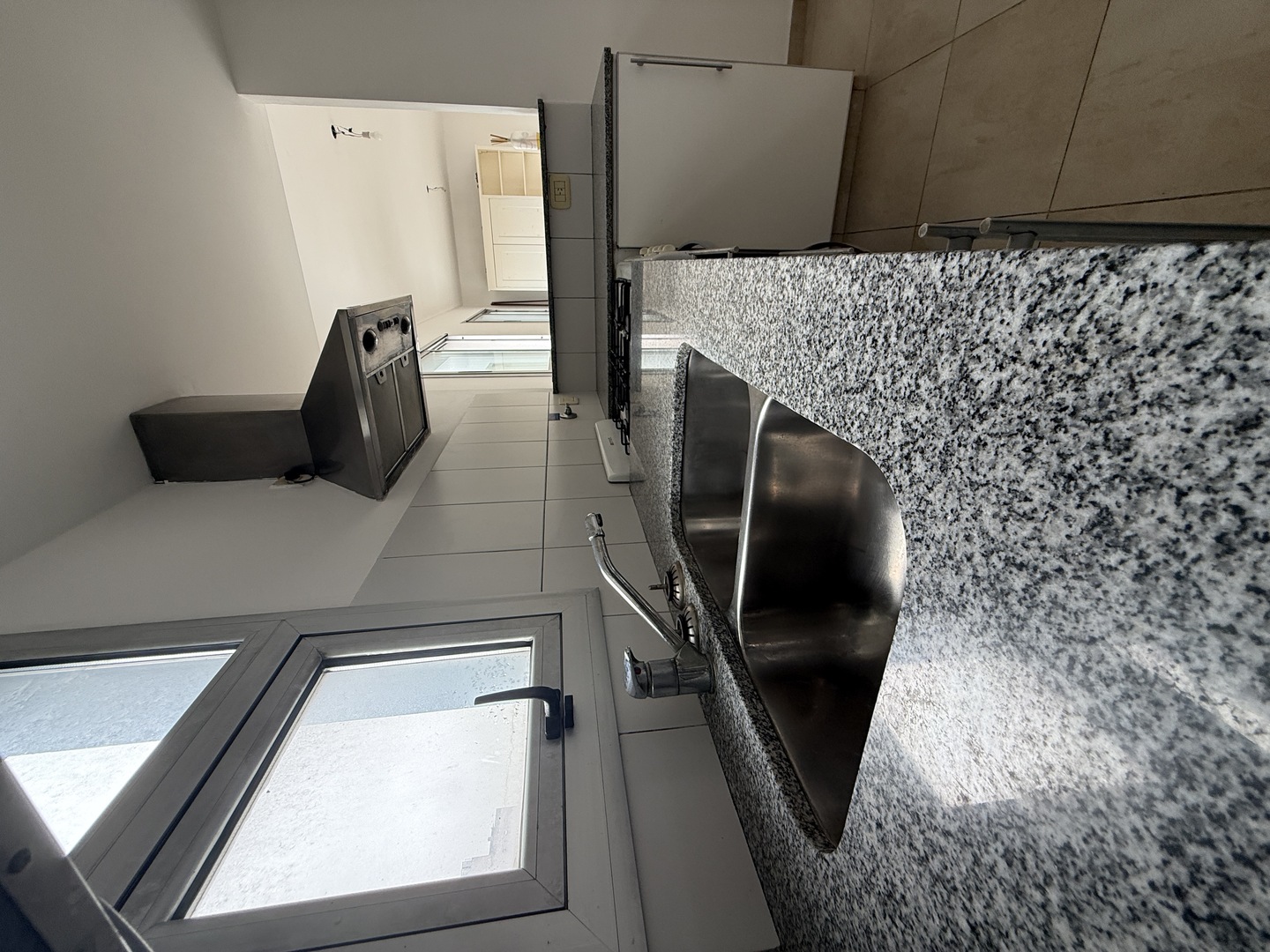 Cocina semi-integrada con barra desayunadora, doble mesada de granito, artefacto cocina, doble bacha con griferia FV monocomando, ventilacion natural.