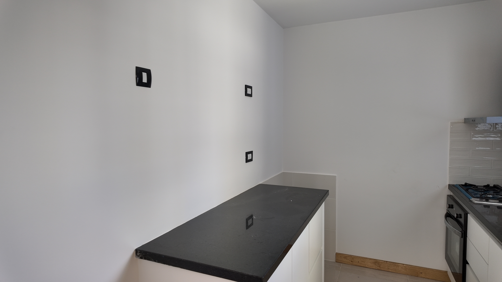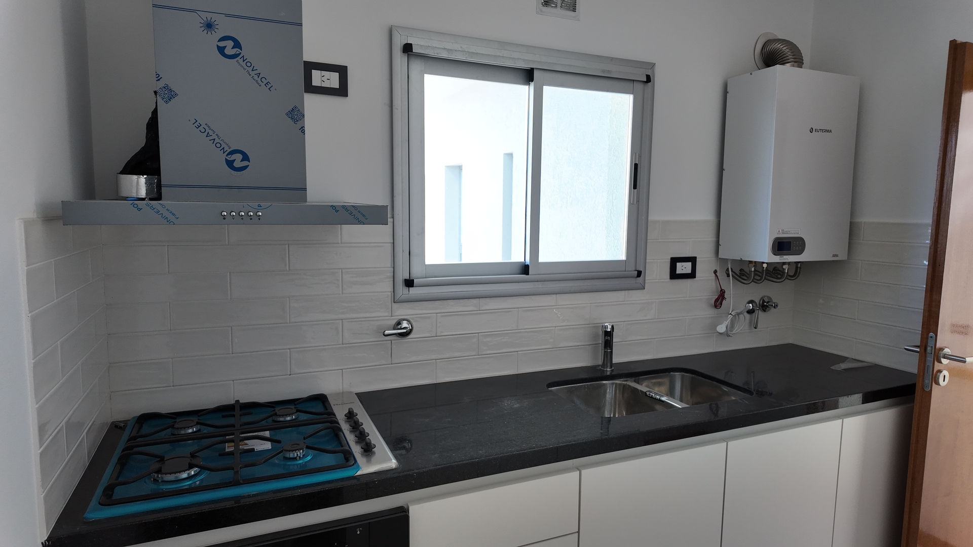 Amplia cocina con doble mesada, muebles completos colocados, Caldera Dual instalada, monocomando, mesada de granito negra y amplia ventilacion