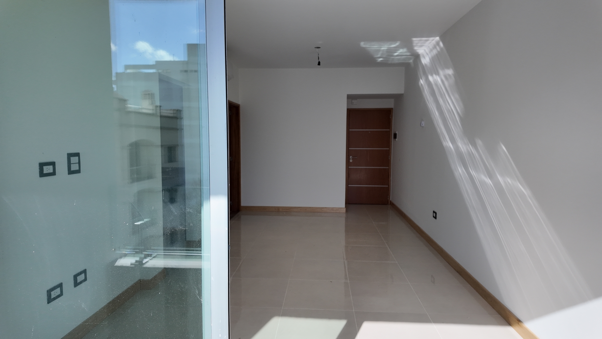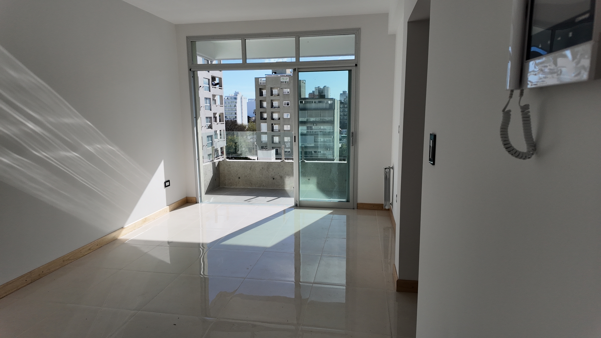 Acceso a un amplio living comedor con aire acondicionado instalado, pisos de porcelanato simil madera, portero visor con camara y Puerta ventana de salida al balcon semicubierto con vistas al frente