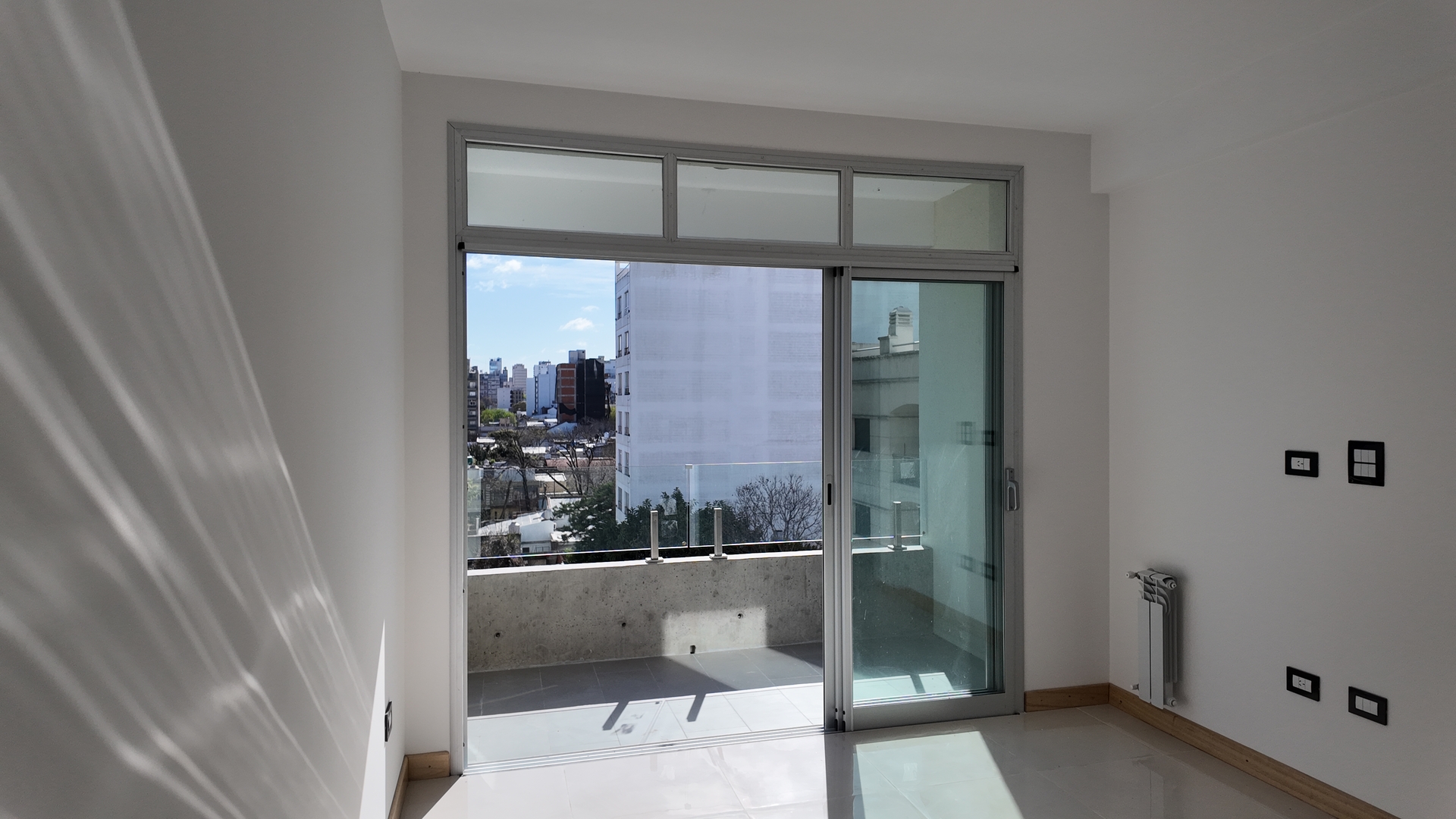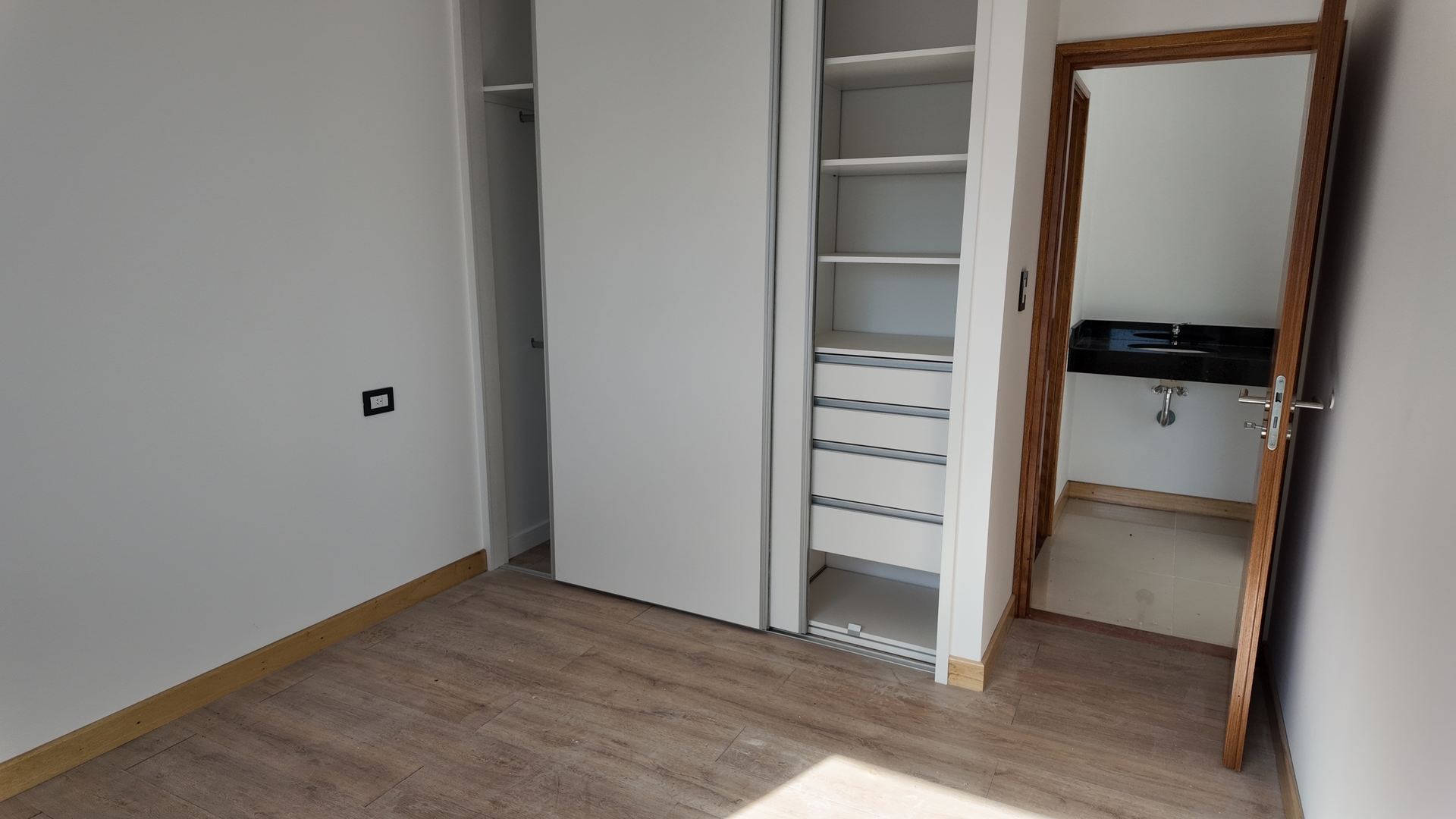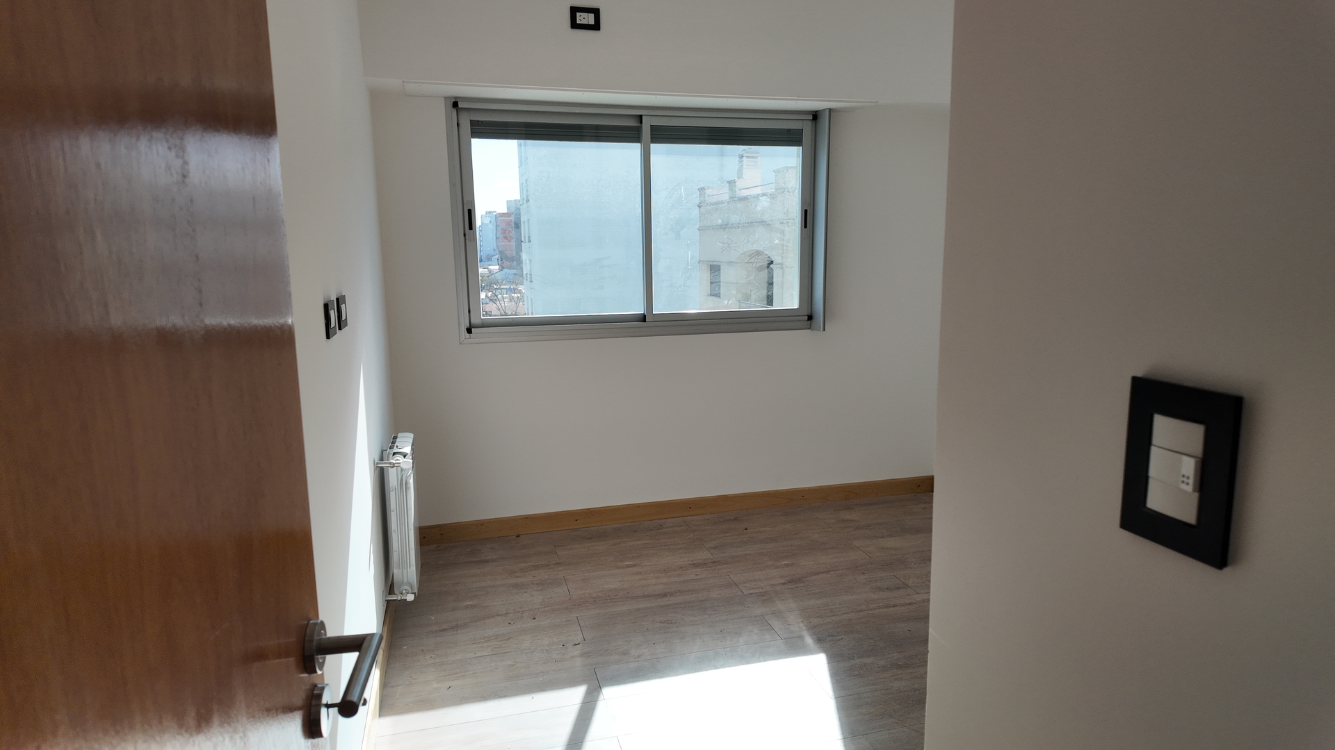 Dormitorio amplio con placard piso simil madera de porcelanato, interiores terminados y persiana. A continuidad del dormitorio un segundo balcon donde se encuentra la caldera y preinstalacion para el Lavarropas