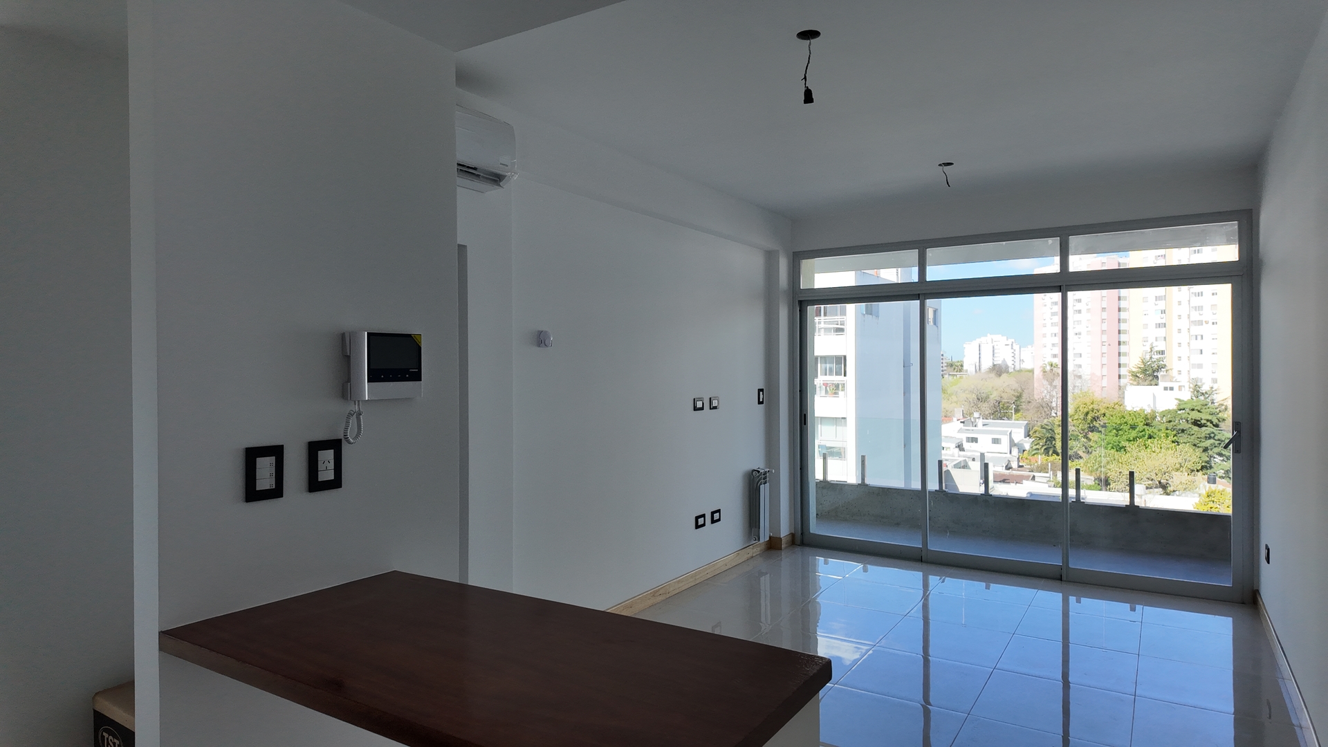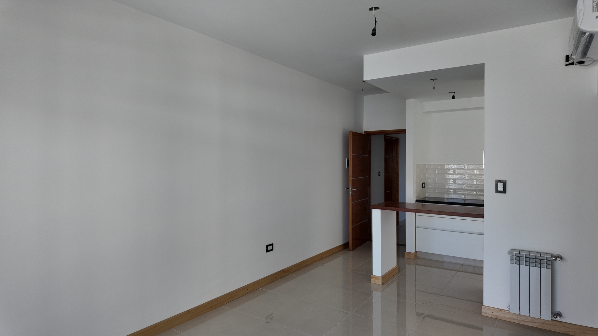 Acceso a un amplio living comedor con aire acondicionado instalado, pisos de porcelanato simil madera, portero visor con camara y Puerta ventana de salida al balcon semicubierto