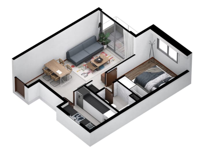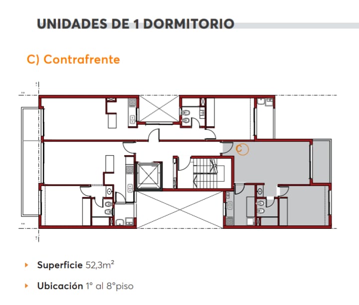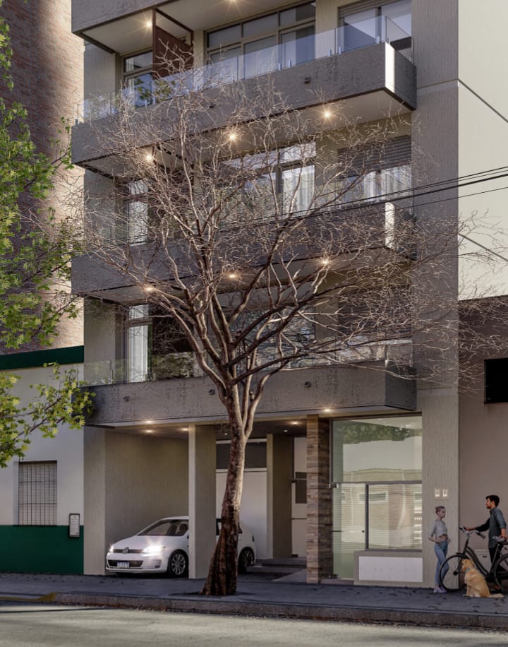 El edificio está compuesto por un único bloque con frente hacia la calle 43, el proyecto se desarrolla en planta baja, con un local comercial y 5 cocheras (2 cubiertas y 3 descubiertas) y 9 pisos con un total de 23 unidades. En el 9° nivel se ubica la terraza común. La planta tipo del 1° al 6° nivel consta de 3 unidades funcionales de 1 dormitorio al frente, contrafrente y semipiso. El 7° y 8° piso posee hacia el frente una unidad de 2 dormitorios y hacia el contrafrente una de 1 dormitorio. En el 9° piso se ubica una unidad de 2 dormitorios, el office del encargado y la terraza común.