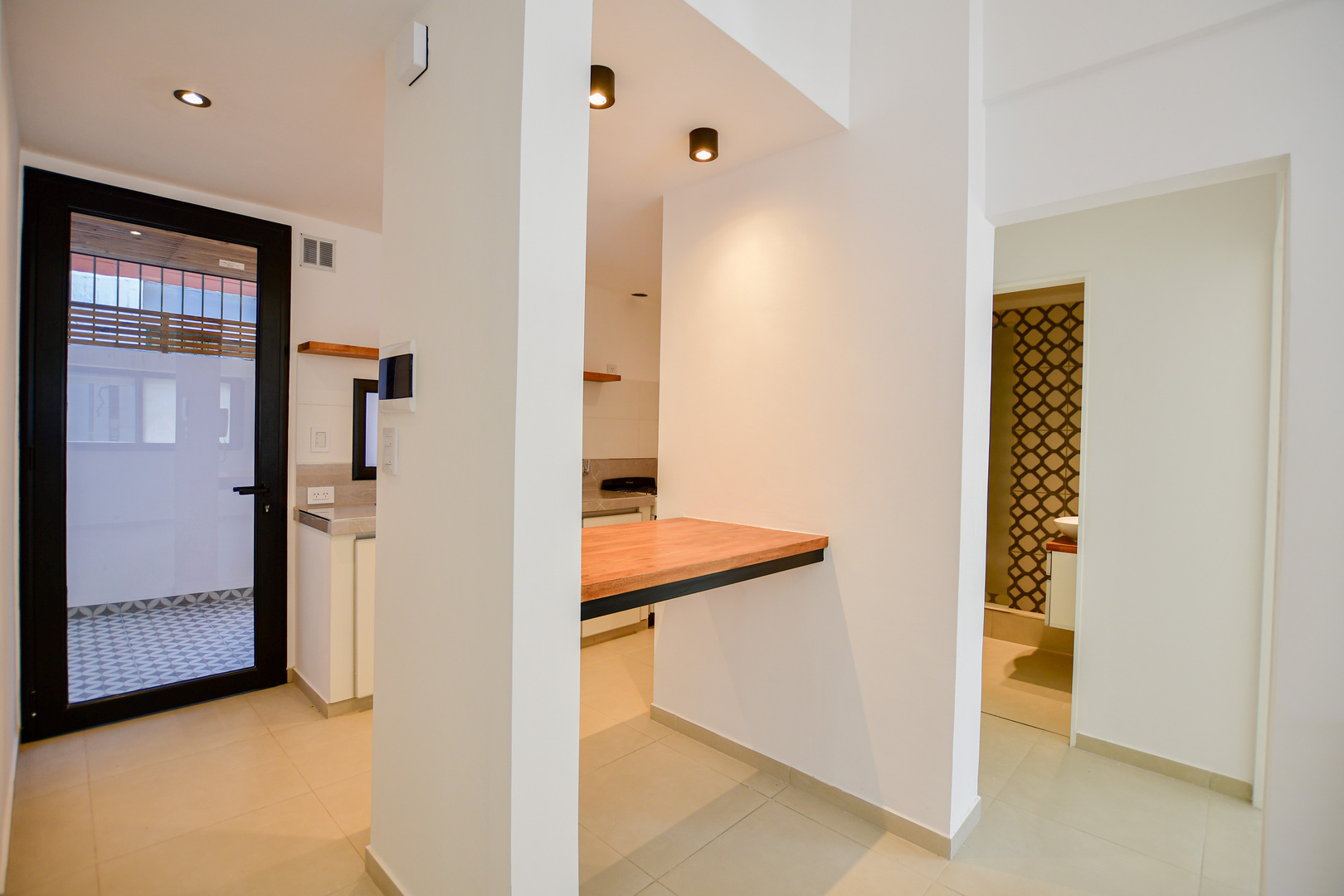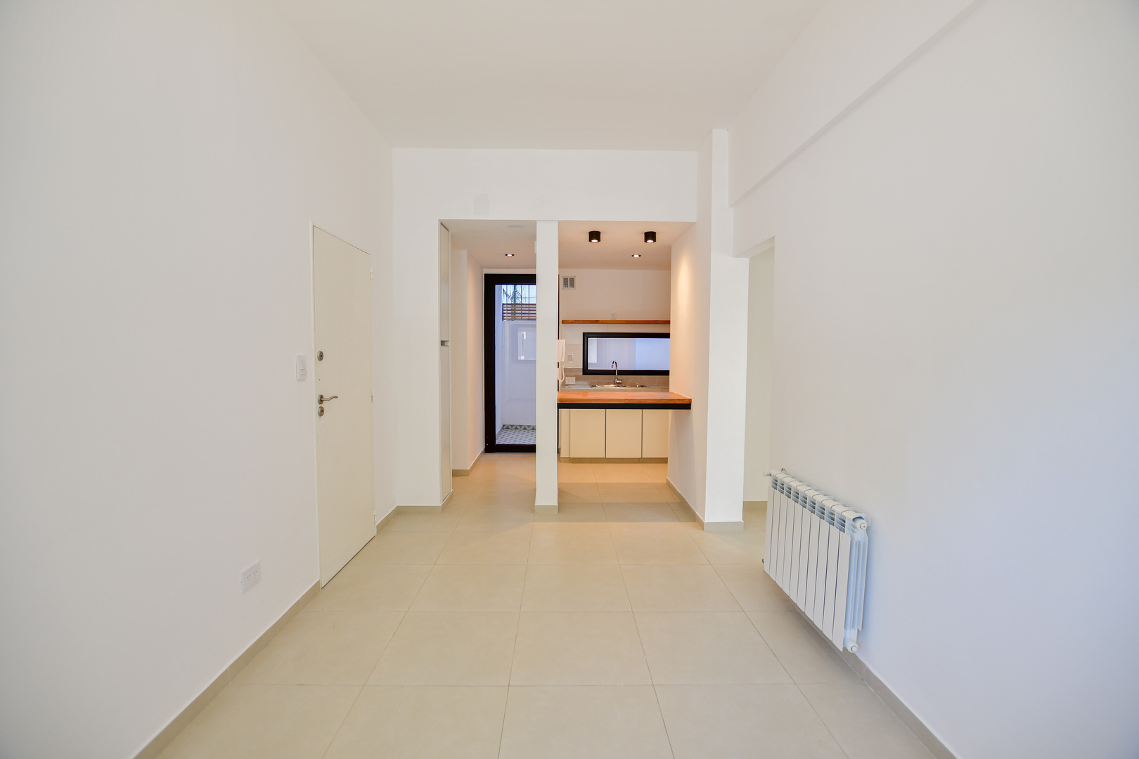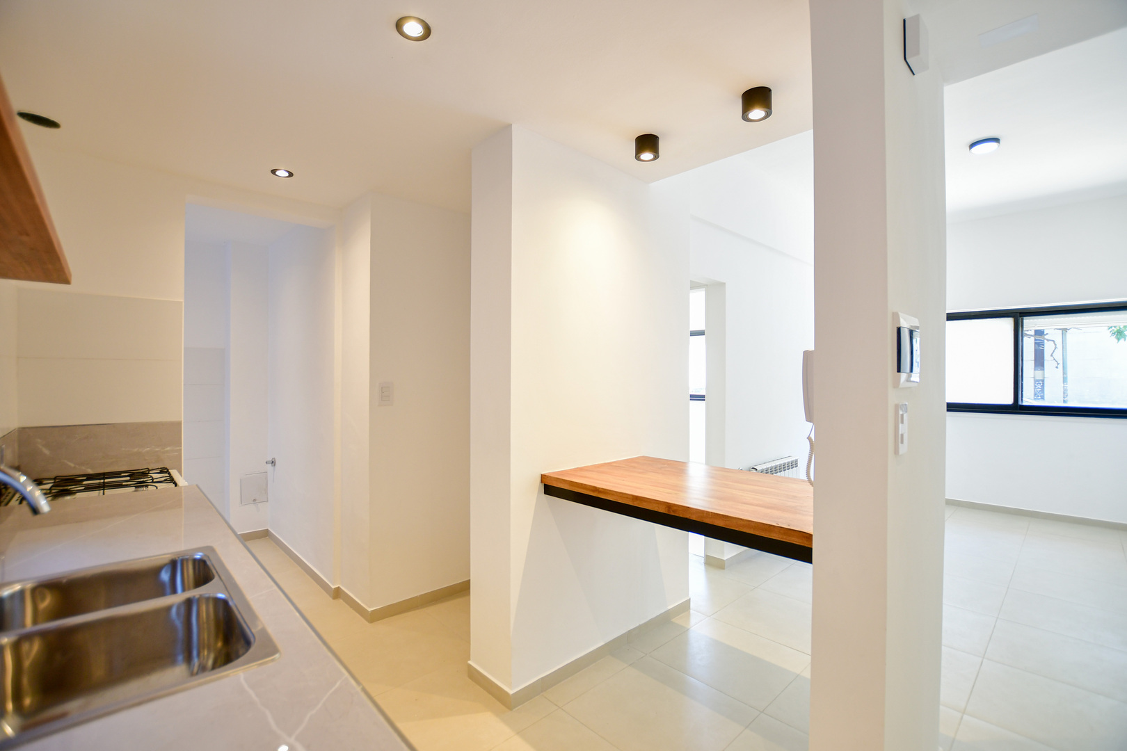 Departamento en planta baja al frente. Living comedor con pisos de porcelanato. Cocina semi-integrada con barra desayunadora equipada con muebles bajo mesada.