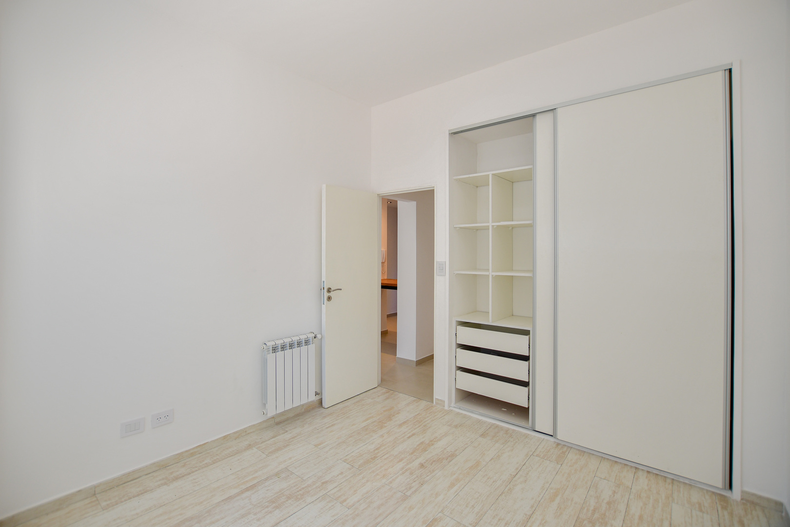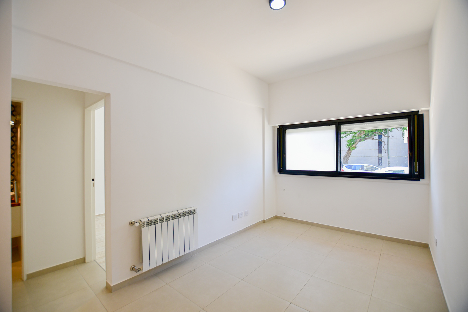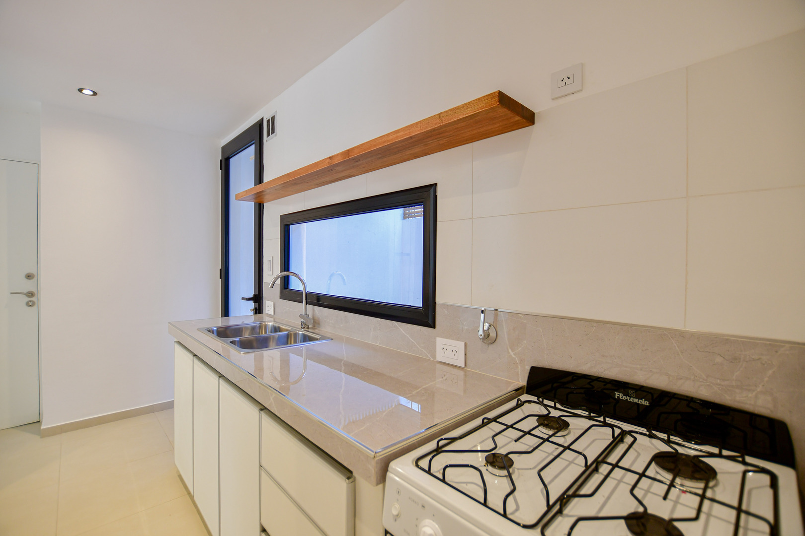 Departamento en planta baja al frente. Living comedor con pisos de porcelanato. Cocina semi-integrada con barra desayunadora equipada con muebles bajo mesada.