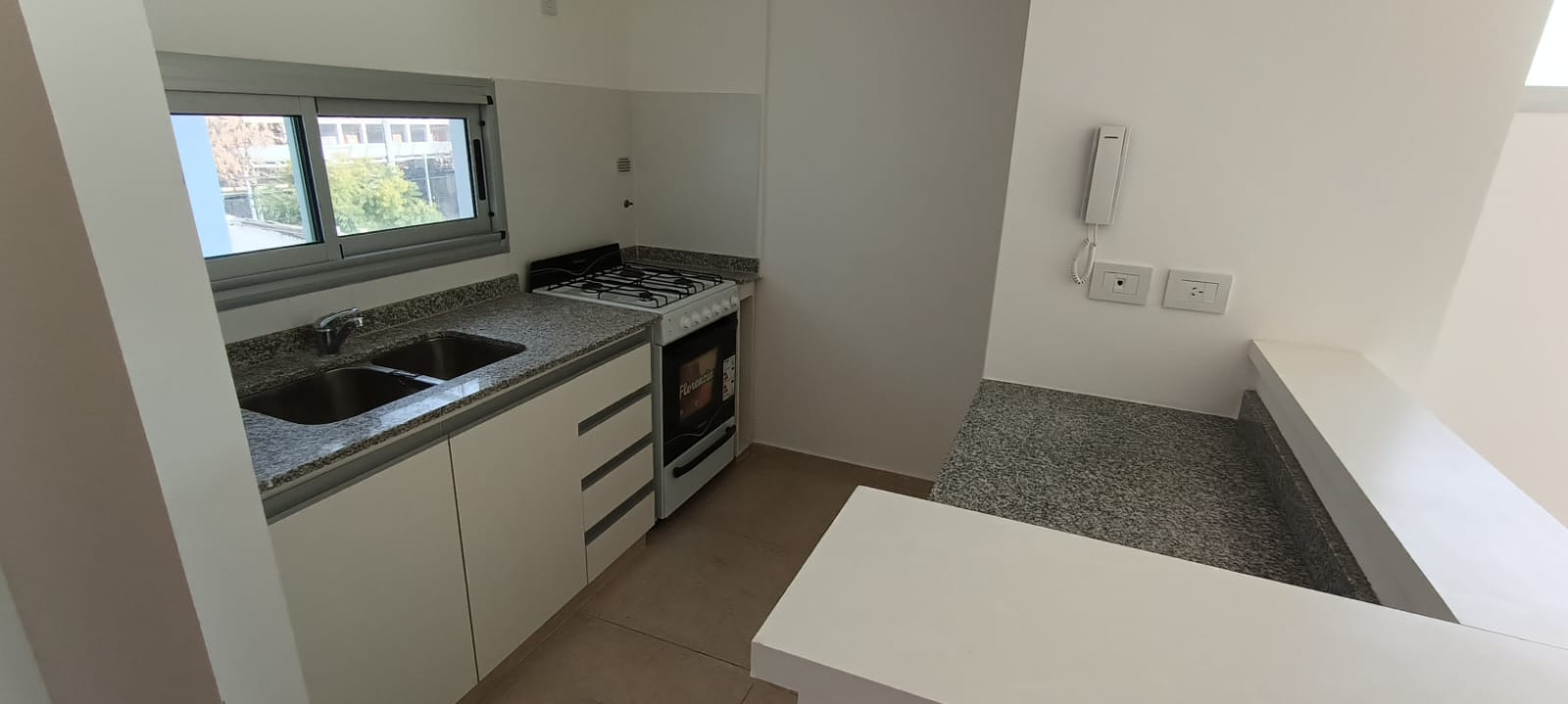 Cocina semi separada por barra desayunadora, mobiliarios completos bajo mesada.