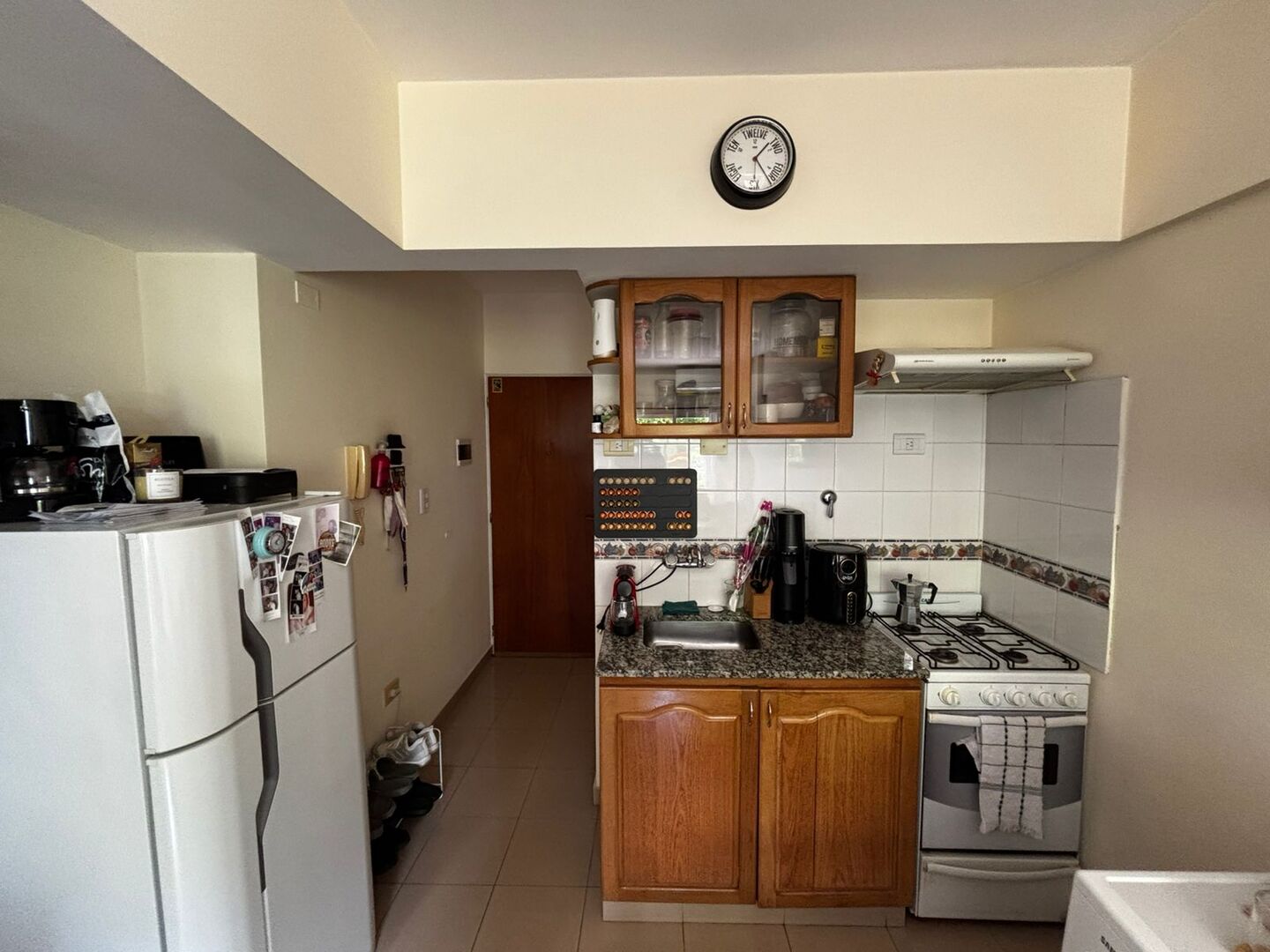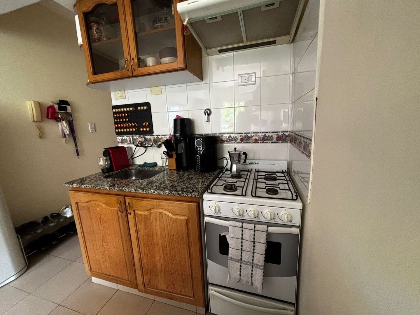 Cocina integrada con extractor, muebles bajo mesada y alacenas.