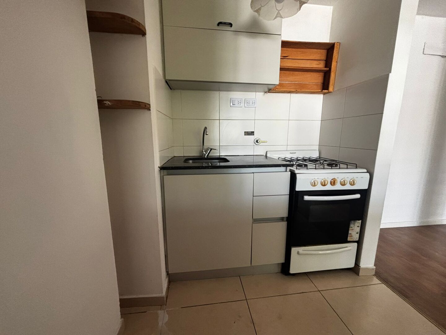 Cocina integrada separada mediante barra desayunadora, equipada con muebles bajo y sobre mesada con conexión para lavarropas.