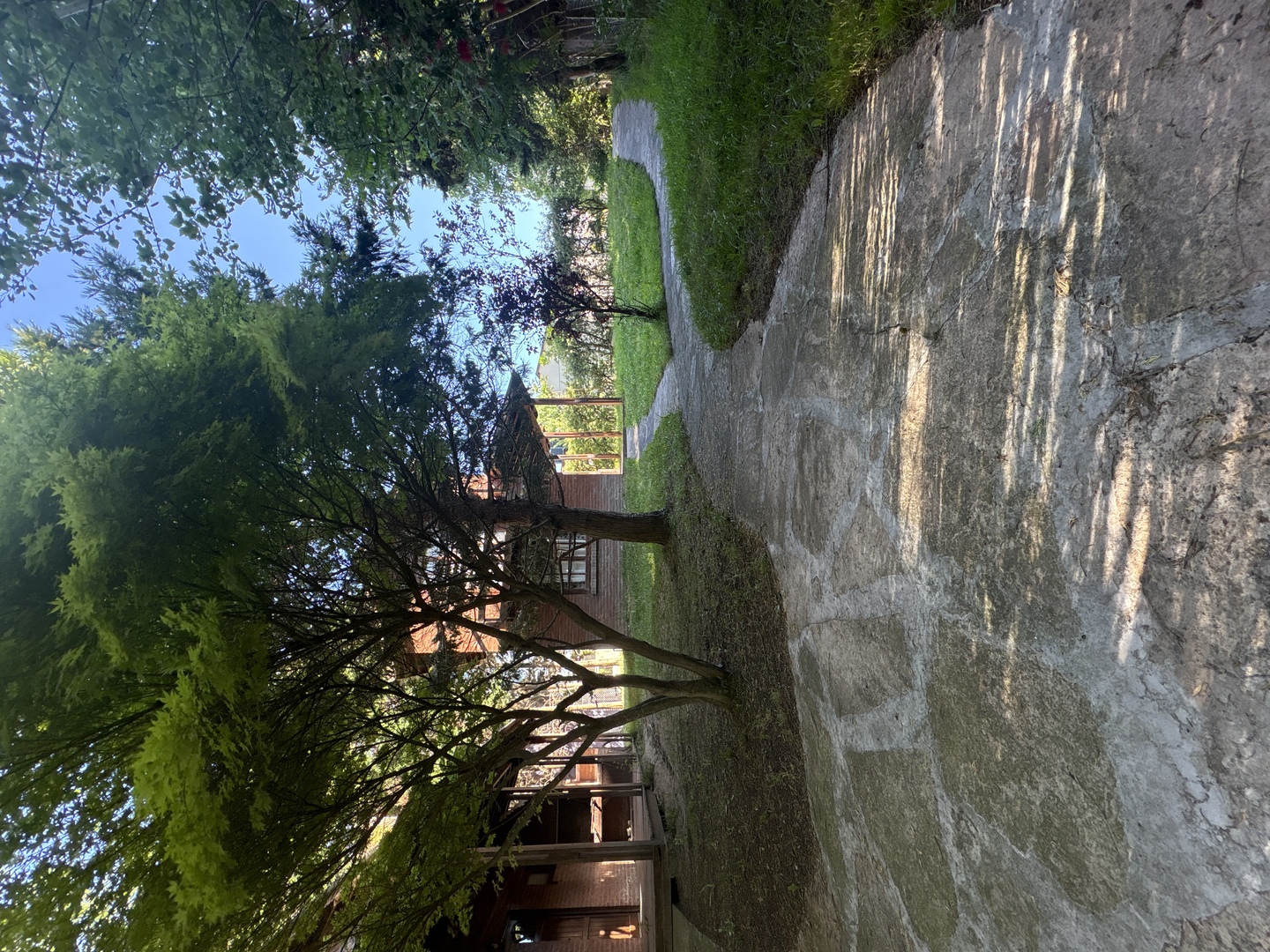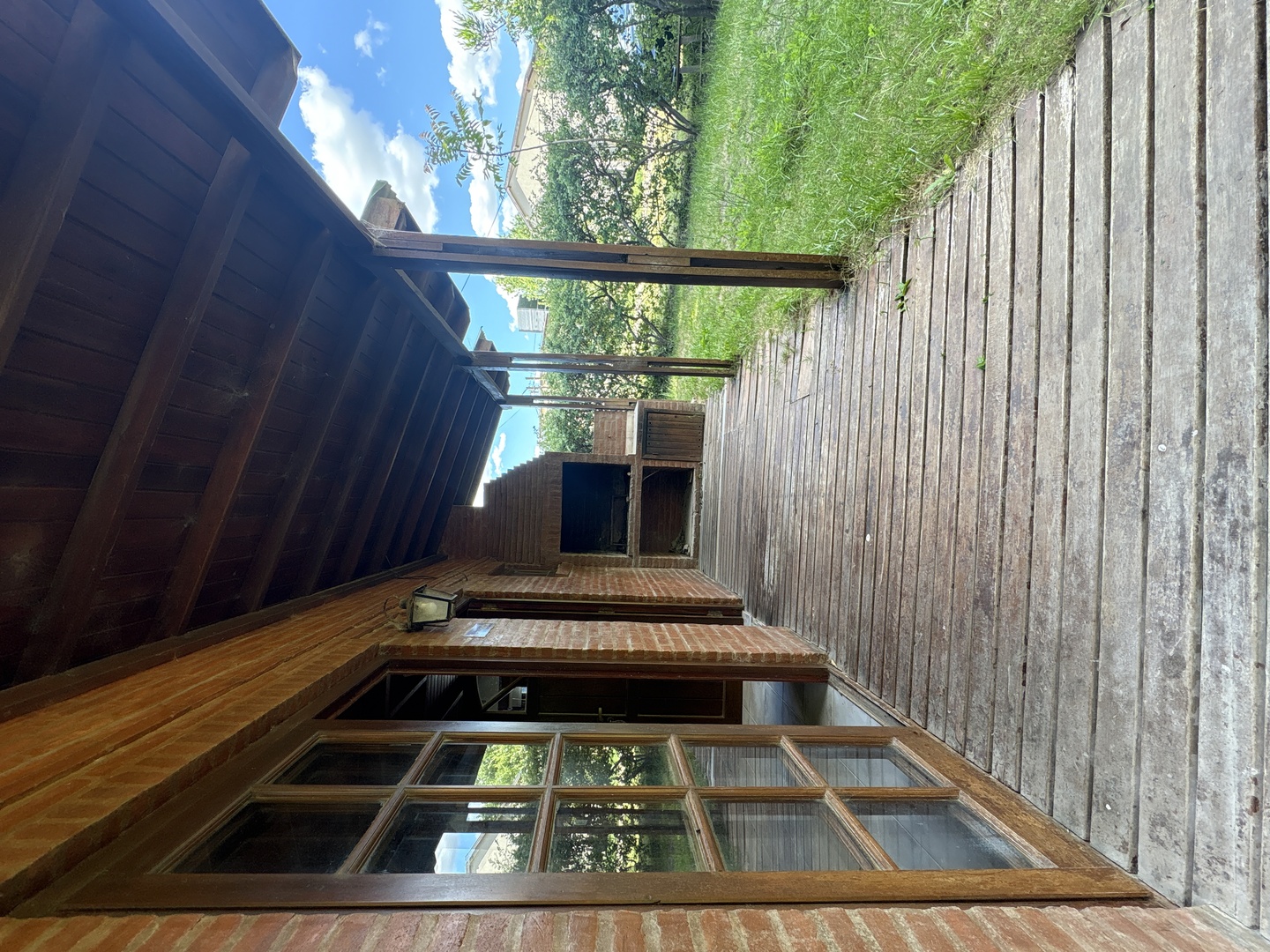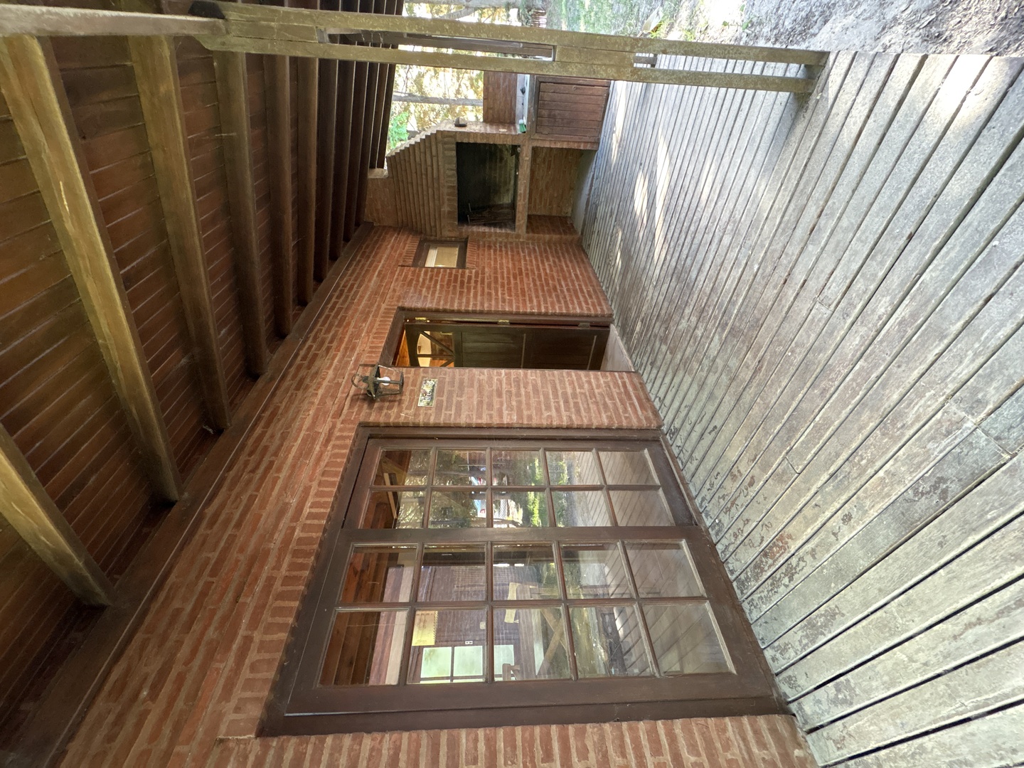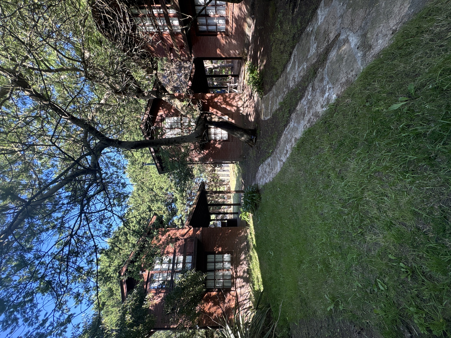 El complejo consta en su frente de 5/6 cocheras descubiertas, al ingresar un camino de lajas guía a los huéspedes a cada una de las casas.